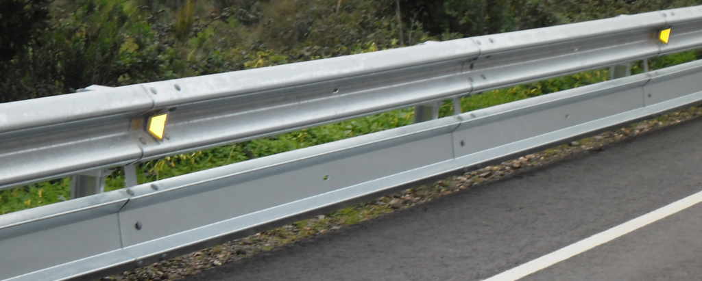Barrera metálica simple reducida para borde lateral. Sistema compuesto por una barrera de dos crestas y postes C distanciados 2.66 metros entre sí.