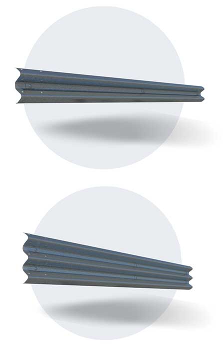 Defensa metálica estándar de 2 y 3 crestas fabricado bajo la norma AASHTO M-180 galvanizada bajo la norma ASTM A123, para su colocación se utilizan postes de IPR de 6’’x4’’ de 1.50 y 1.75 mt respectivamente, separadores CANAL U, separador IPR, separador de plástico o madera, ménsula reflejante y tornillería.